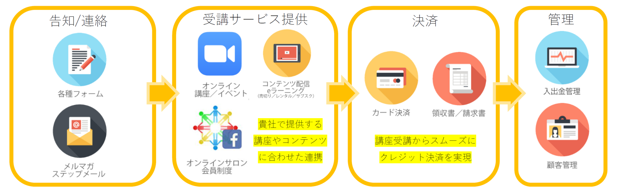集客/連絡→受講→決済→入出金管理→顧客管理まで